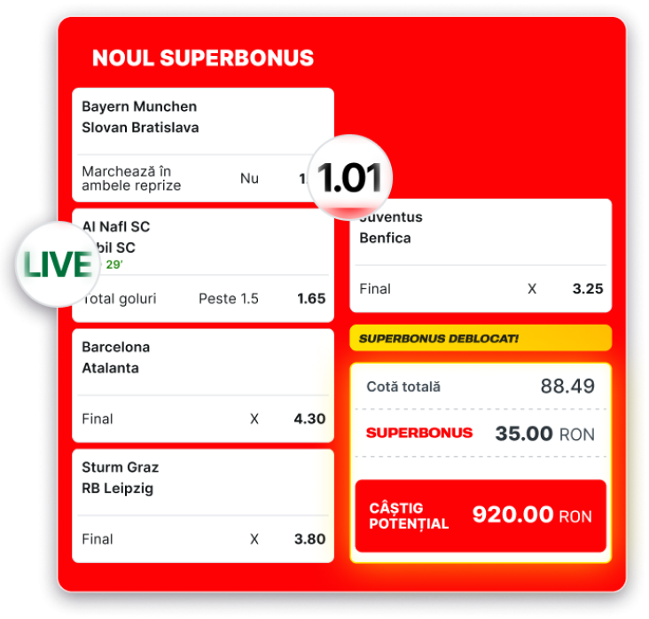 Odată ce ai deblocat Superbonusul pentru biletul tău, poți adăuga orice altă cotă pre-meci sau live, inclusiv 1.01, și biletul va fi în continuare eligibil pentru Superbonus.